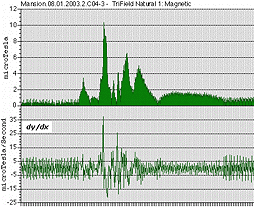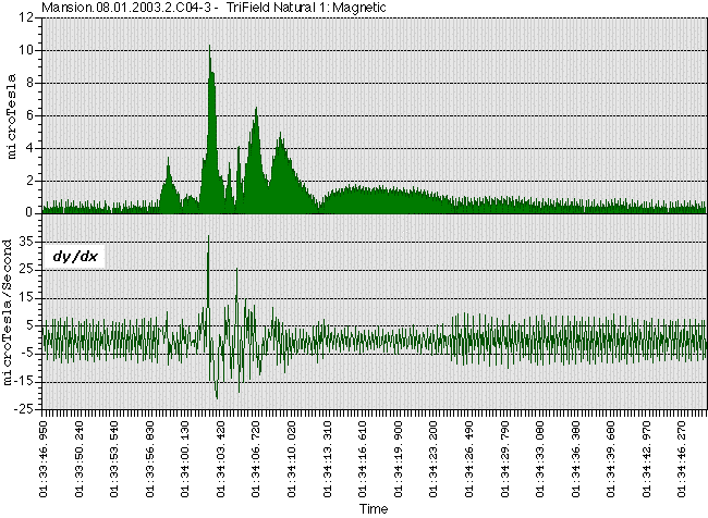 The graphs and data files on the left are good examples of the data obtained by Arcadia at various stages of analysis. The raw data file is available to download here, and the calculated derivative of the data file is available here. Keep in mind that this data file is a REAL anomaly, recorded by Arcadia at the historic Overholser Mansion in Oklahoma City, while the building was completely empty (it's the largest local DC magnetic field shift Arcadia has ever recorded, period.). The top graph is the graph of the regular data file, and is a fine example of a digital file converted to an analog view that the human eye can understand. The graph below it is the derivative of the top graph, which shows the rate of change in microTesla per second. In the derivative graph, you can easily see when the field strength is increasing or decreasing (positive or negative rate of change, respectively), which makes the derivative graph of an anomaly a valuable tool in analysis.